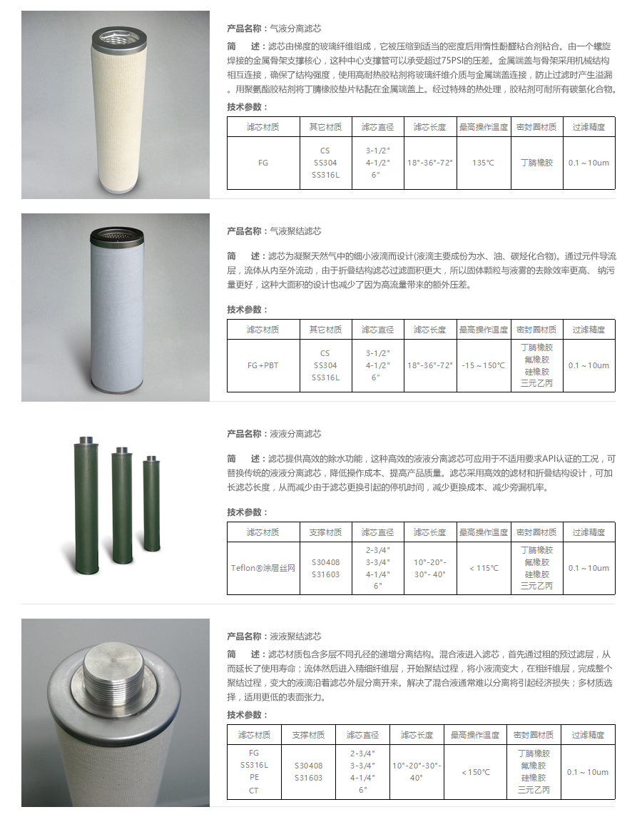 聚結(jié)濾芯是干氣過(guò)濾器及聚結(jié)過(guò)濾器的核心部件,采用多項(xiàng)核心技術(shù)生產(chǎn)的各種聚結(jié)濾芯,能有效的消除氣體中的顆粒雜質(zhì)及水霧、油污等介質(zhì);或液體中的顆粒雜質(zhì)及油污等介質(zhì)。實(shí)現(xiàn)氣液分離、氣液聚結(jié)、液液分離、液液聚結(jié)等理想效果。