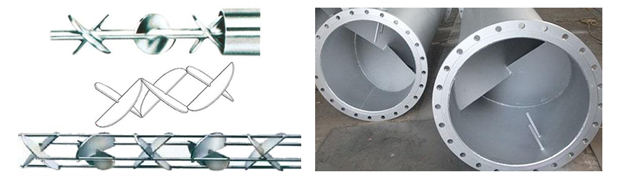 SD型靜態(tài)混合器的混合過程是靠固定在管內(nèi)的混合元件進(jìn)行的,由于混合元件的作用,使流體時(shí)而左旋時(shí)而右旋,不斷改變流動(dòng)方向,不僅將中心液流推向周邊,而且將周邊流體推向中心,從而造成良好的徑向混合效果。