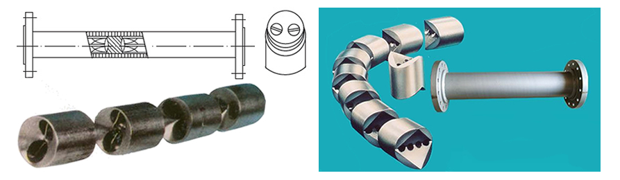 SH型靜態(tài)混合器又稱雙螺旋形靜態(tài)混合器,每個(gè)SH型單元內(nèi)有二個(gè)螺旋片,相鄰的SH型單元之間有混合室。單元由雙孔道組成,孔道內(nèi)放置螺旋片,相鄰單元雙孔道的方位互相垂直,單元之間設(shè)有流體再分配室。