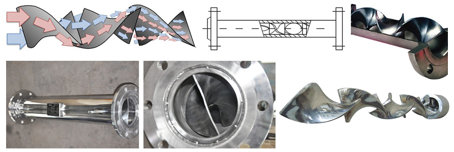 SK型靜態(tài)混合器的混合過程是靠固定在管內(nèi)的混合元件進(jìn)行的,由于混合元件的作用,使流體時而左旋時而右旋,不斷改變流動方向,不僅將中心液流推向周邊,而且將周邊流體推向中心,從而造成良好的徑向混合效果。與此同進(jìn),流體自身的旋轉(zhuǎn)作用在相鄰元件連接處的界面上亦會發(fā)生。這種完善的徑向環(huán)流混合作用,使流體在管子截面上的溫度梯度、速度梯度和質(zhì)量梯度明顯減少。