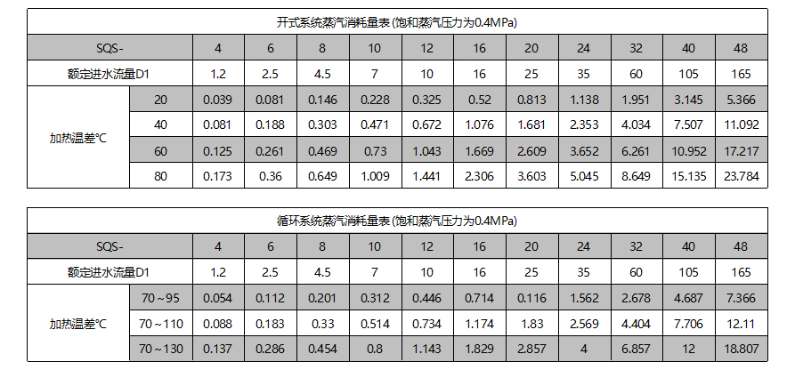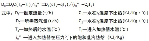 對于不同型號規(guī)格的加熱器,在額定流量下,加熱不同溫度的熱水所需蒸汽量可由下式計算: