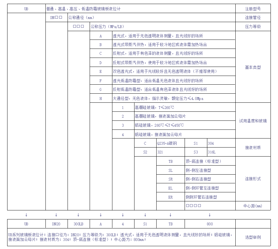 UB系列普通、高溫、高壓、低溫防霜、大通徑型玻璃板液位計可直接用來指示各種工業(yè)容器內(nèi)介質(zhì)的液位高度。在工作溫度260℃以下采用經(jīng)過熱處理硼硅酸鹽玻璃,260℃以上采用經(jīng)過熱處理特殊加工的鋁硅酸鹽玻璃,能承受420℃介質(zhì)溫度。在接液面上覆蓋一層云母。