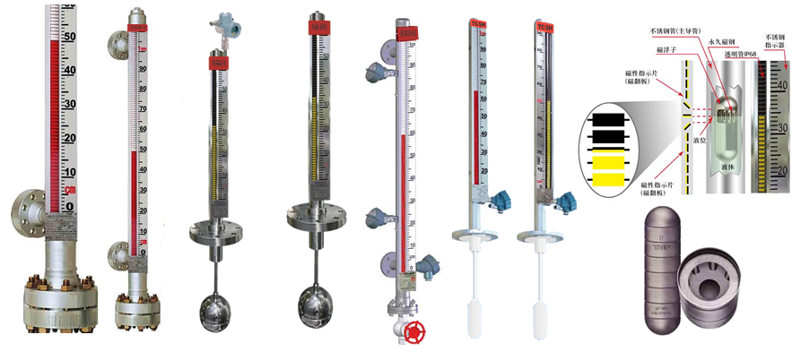 液位計是根據(jù)浮力原理和磁性耦合作用原理工作的。當被測容器中的液位升降時,液位計主導管中的浮子也隨之升降。浮子內(nèi)的永久磁鋼通過磁耦合傳遞到現(xiàn)場指示器,驅(qū)動紅、白翻柱翻轉(zhuǎn)180°;當液位上升時,翻柱由白色轉(zhuǎn)為紅色,當液位下降時,翻柱由紅色轉(zhuǎn)為白色,指示器的紅、白界位處為容器內(nèi)介質(zhì)液位的實際高度,從而實現(xiàn)現(xiàn)場液位的指示。